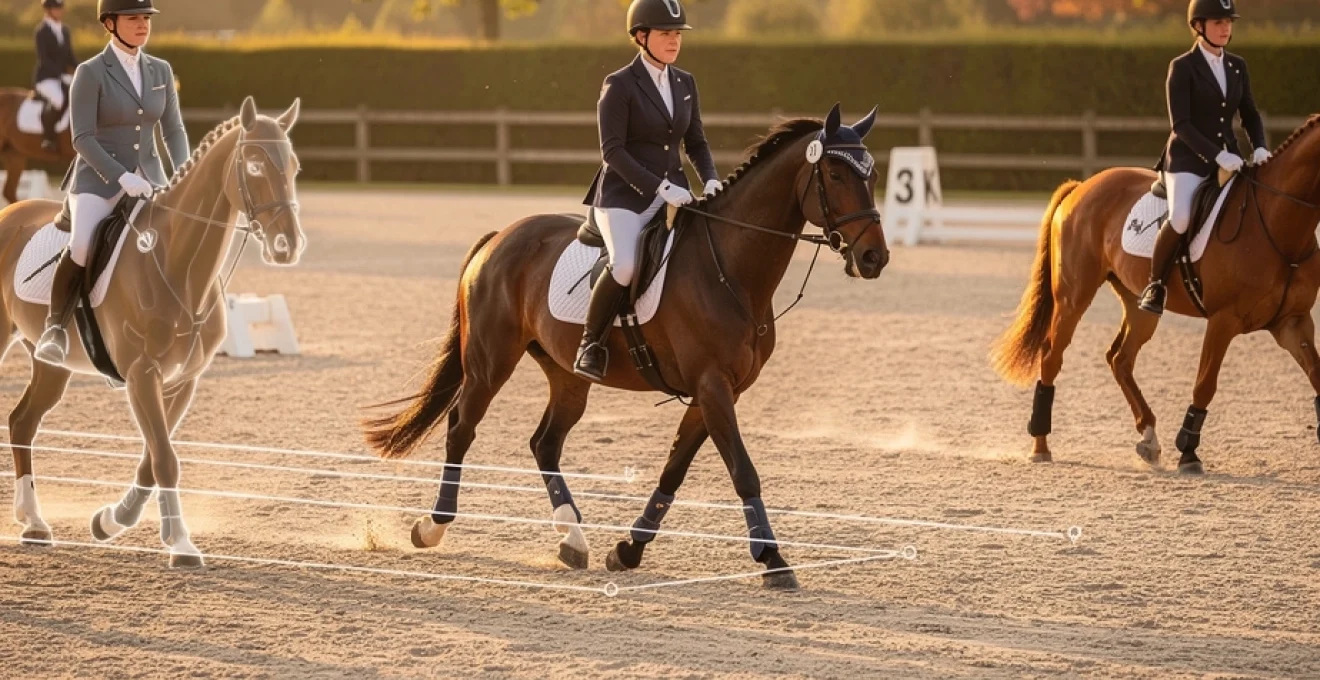 Sur la ligne droite, veillez à la rectitude : vos deux rênes doivent encadrer l’encolure de façon symétrique, vos deux jambes restent à égale distance du cheval. Si vous sentez que celui-ci se déporte, corrigez par de légers ajustements plutôt que par de grandes actions. Sur les diagonales, profitez du changement de main pour vérifier que vos aides sont bien différenciées d’un côté et de l’autre, notamment dans les départs au galop. Varier les points de transition (lettres, milieu de diagonale, entrée de coin) empêche le cheval d’anticiper et améliore son attention.